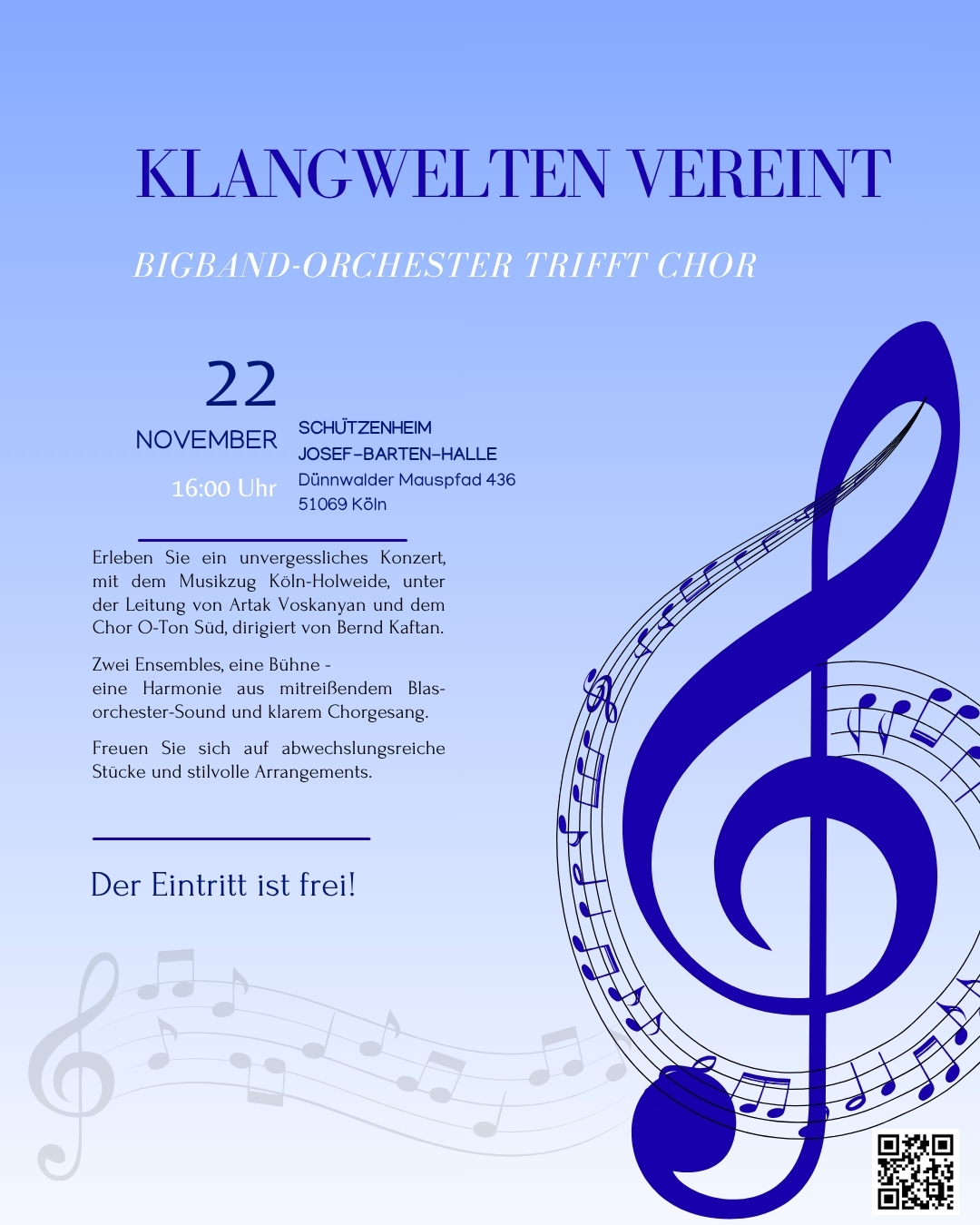 Gemeinsames Konzert meines Chores O-Ton Süd mit dem Bigbandorchester Holweide. Wir freuen uns auf ein außergewöhnliches Konzert!