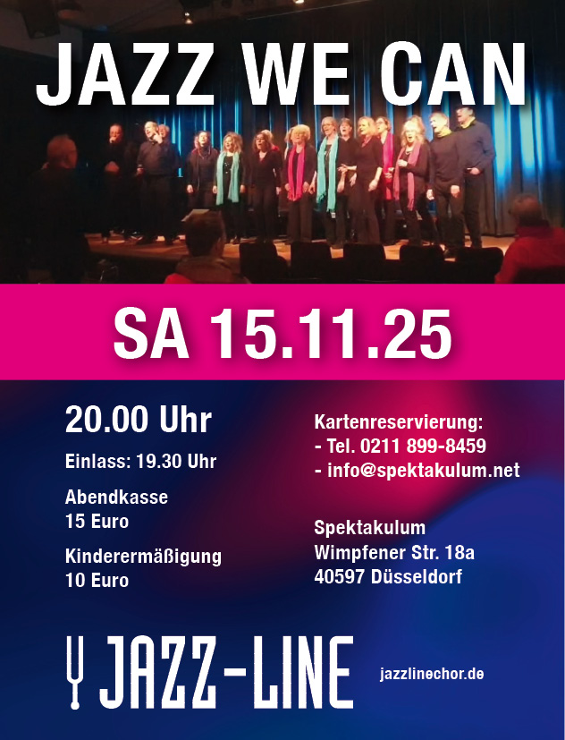 Jazzline Chor – Jazz We Can Zeige grösseres Bild Termin DetailsDatum: 15. November 2025 20:00 – 22:00Chor-Konzert mit unserem neuen Programm!Bernd Kaftan2025-11-04T16:39:16+01:004. November 2025|Teilen:FacebookXRedditLinkedInWhatsAppTumblrPinterestVkXingE-Mail